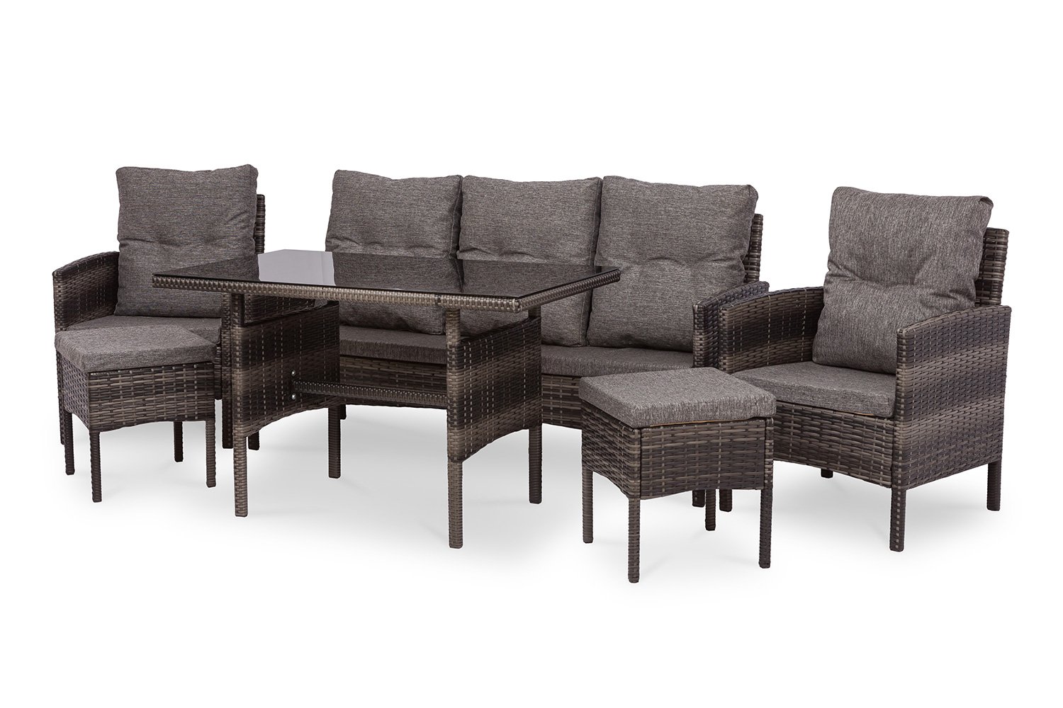 В комплект мебели Фарелл входят диван 163х77х65 см, два кресла 62х77х65 см, два пуфа 39х39х39 см и обеденный стол 120х70х70 см. вся мебель отличается особым дизайном – мебель выглядит так, будто создана по классическим методам переплетения деревянных волокон, однако конкретно эта мебель состоит из новейших материалов, специально созданных для эксплуатации на улице. Так, каркас мебели – это металл, но он надежно скрыт переплетением искусственного ротанга корично-бежевого цвета. Искусственный ротанг не плесневеет от влаги, и не теряет свой цвет на солнце. Столешница обеденного стола для дополнительного удобства покрыта стеклом – это и необычный дизайн, и упрощенная возможность протереть стол после трапезы.