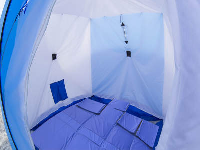 - С помощью 4-х оттяжек установка палатки занимает минимум времени, а на льду она держится очень крепко. С помощью этих же фиксаторов можно перемещать укрытие с содержимым с места на место.