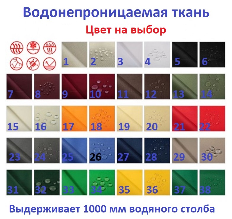 Тент-крыша на 8 секций имеет следующие габаритные размеры 260х260х280см, на 10 – 320х320х300см, на 12 секций – 380х380х320см. Для окрашивания материала используется стойкий краситель, который сохраняет яркость и насыщенность на протяжении всего срока эксплуатации. Все изделия пошиты из полиэстеровой ткани - Oxford 210D, которая обладает такими преимуществами, как: