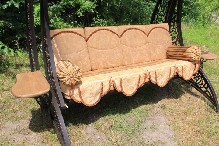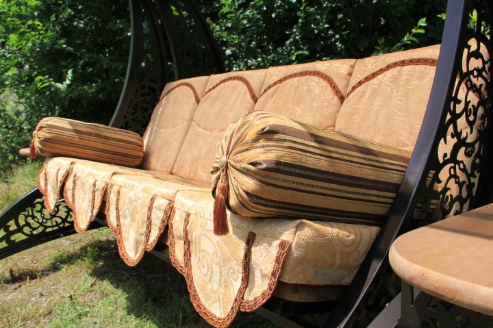 Это мягкая часть для качелей, благодаря ей вы сможете насладиться отдыхом на своей садовой качели полноценно. В мягкую основу включены скреплённые друг с другом части, которые при необходимости с лёгкостью можно отсоединить. В комплекте находятся две подушки-валика, выполненные в арабском стиле. Размер составляет 180 на 100 см, а толщина поролона составляет 10 см. Из преимуществ данного изделия можно выделить то, что оно сделано из очень плотной и прочной ткани, которая обладает высокой износостойкостью. Ее с легкостью можно почистить, а также достаточно трудно растянуть.